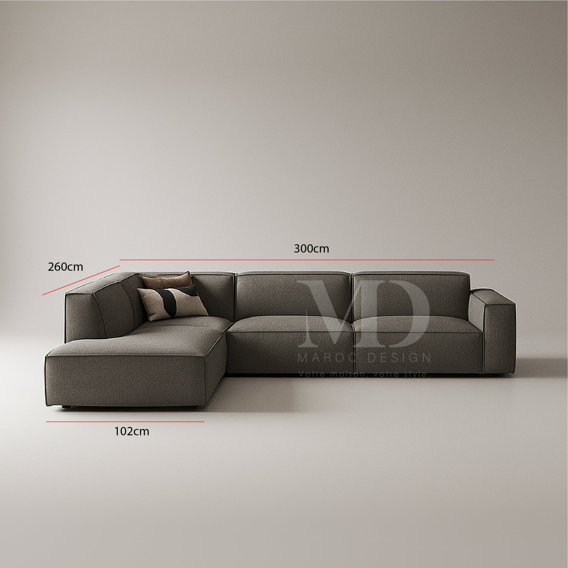 - Dimensions : 260 cm x 300 cm (configuration modulable).